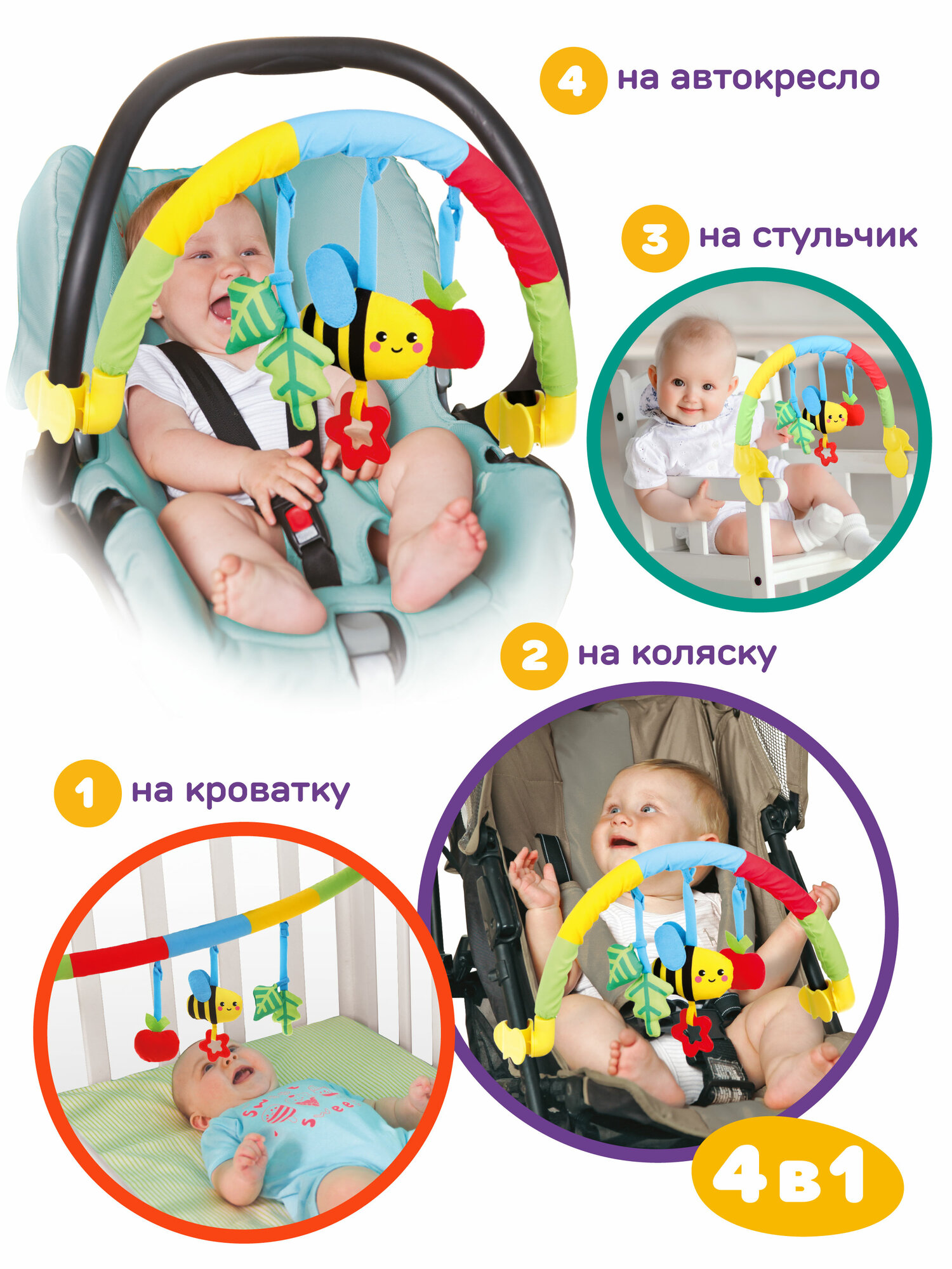 Дуга "Пчелка": 4 съем. игр. крепл. прищепка, 3в1 кроват., коляс., автокрес.