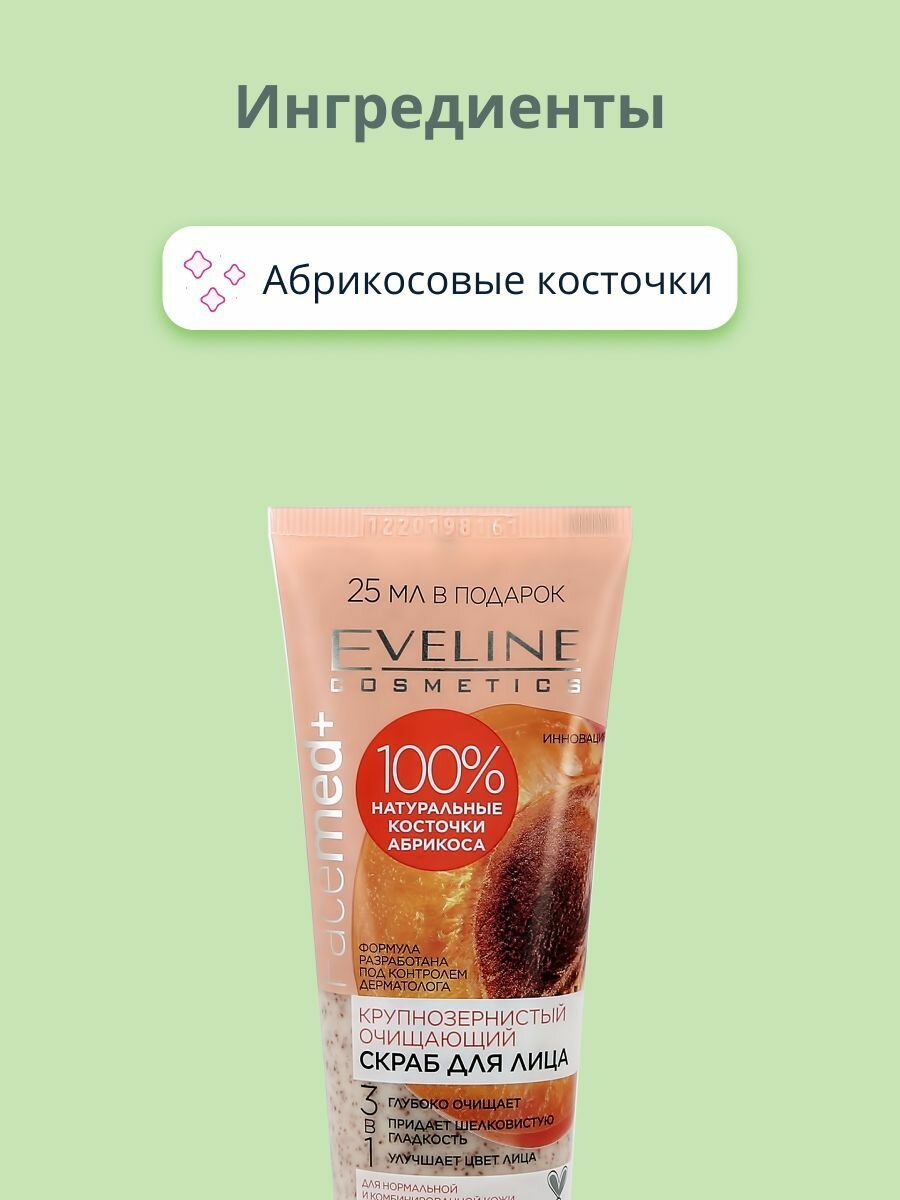 10 цен на EVELINE Скраб для лица FACEMED+ 3 в 1 крупнозернистый очищающий (с 100% натуральными косточками абрикоса) 75 мл