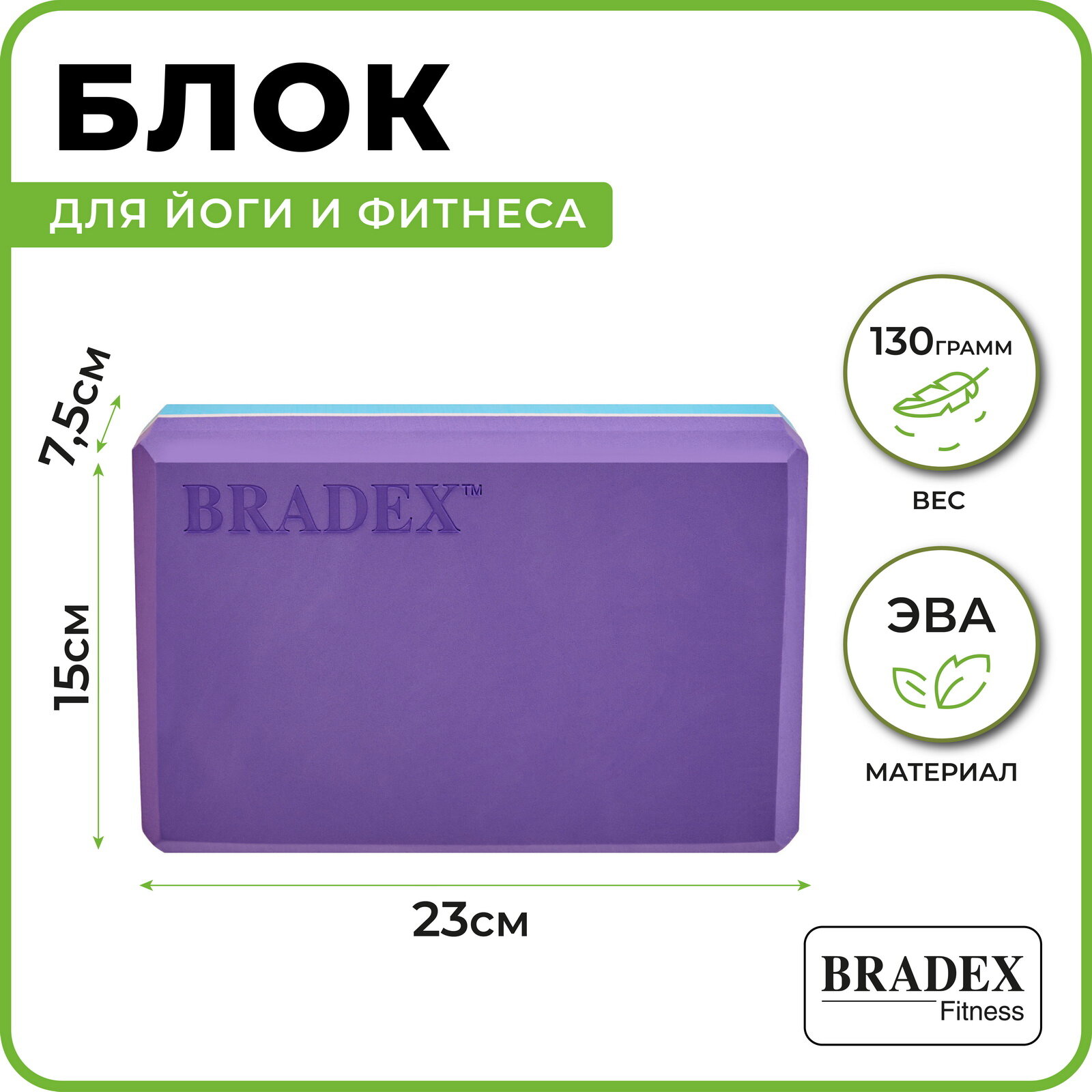 Блок для йоги BRADEX, кирпич для фитнеса и гимнастики, опорный кубик для растяжки, 23х15х7,5 см, фиолетовый 530 ₽