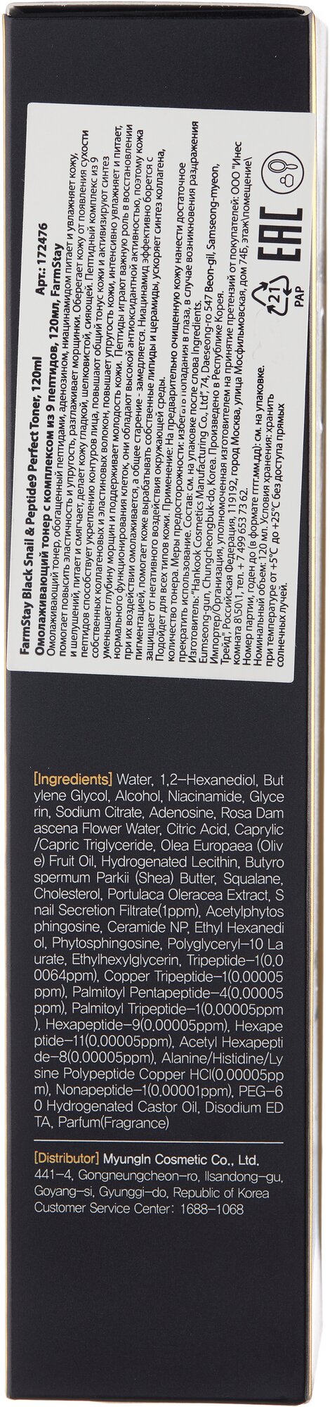 Тонер с черной улиткой и пептидами – FarmStay Black Snail & Peptide 9 Perfect Toner 120ml 1 406 ₽