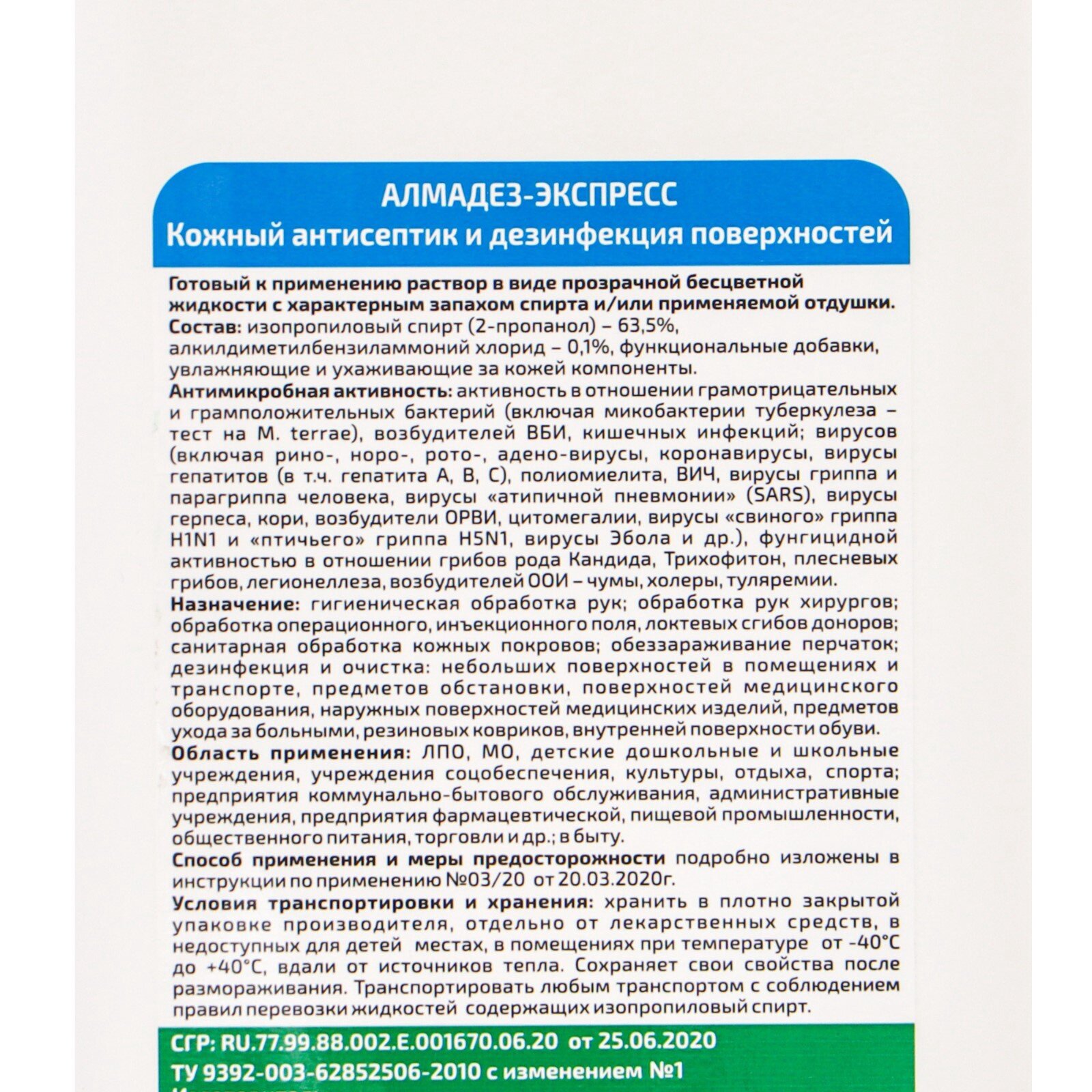 Антисептик для рук и поверхностей спиртосодержащий (63%) 1 л алмадез-экспресс, дезинфицирующий, жидкость, АЭ-503, 606467 информация: