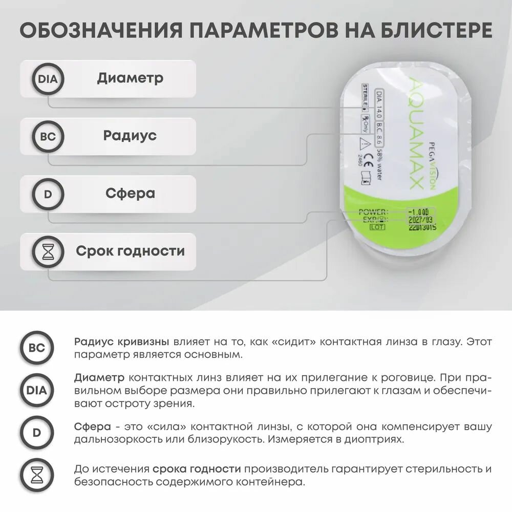 AQUAMAX 6 линз В упаковке 6 штук Оптическая сила -2.25 Радиус кривизны 8.6