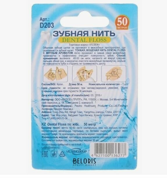 10 цен на Зубная нить Vilsen, с ароматом мяты, вощеная, 50м