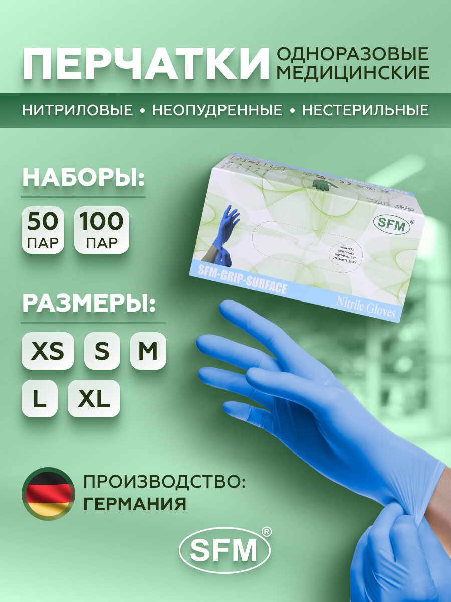 10 цен на Перчатки нитриловые смотровые SFM-GRIP-SURFACE, медицинские, НЕ стерильные, НЕ опудренные, Размер XS (5-6), SFM, Германия, 50 пар