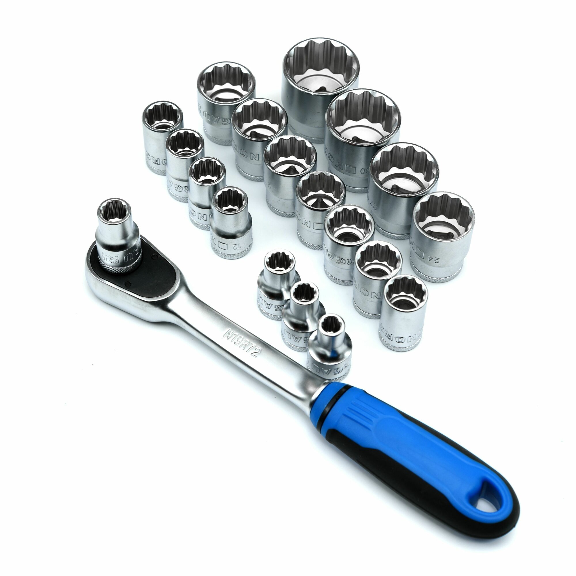 10 цен на Набор головок 1/2 c трещоткой NORGAU Industrial, (8-32 мм), 24 предмета, 12-гранные