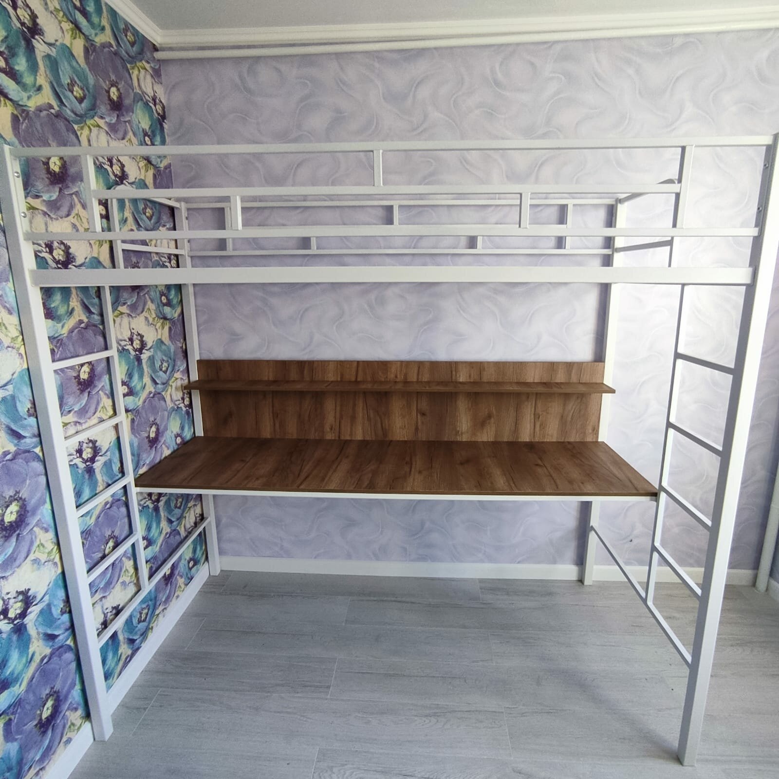 Кровать-чердак "Амстердам" Белый со столом Венге/ детская/ 90х190 см/ двухъярусная кровать с рабочей зоной/ для детей и взрослых/ железная/ металлическая/ двухэтажная/ взрослая/ высокая