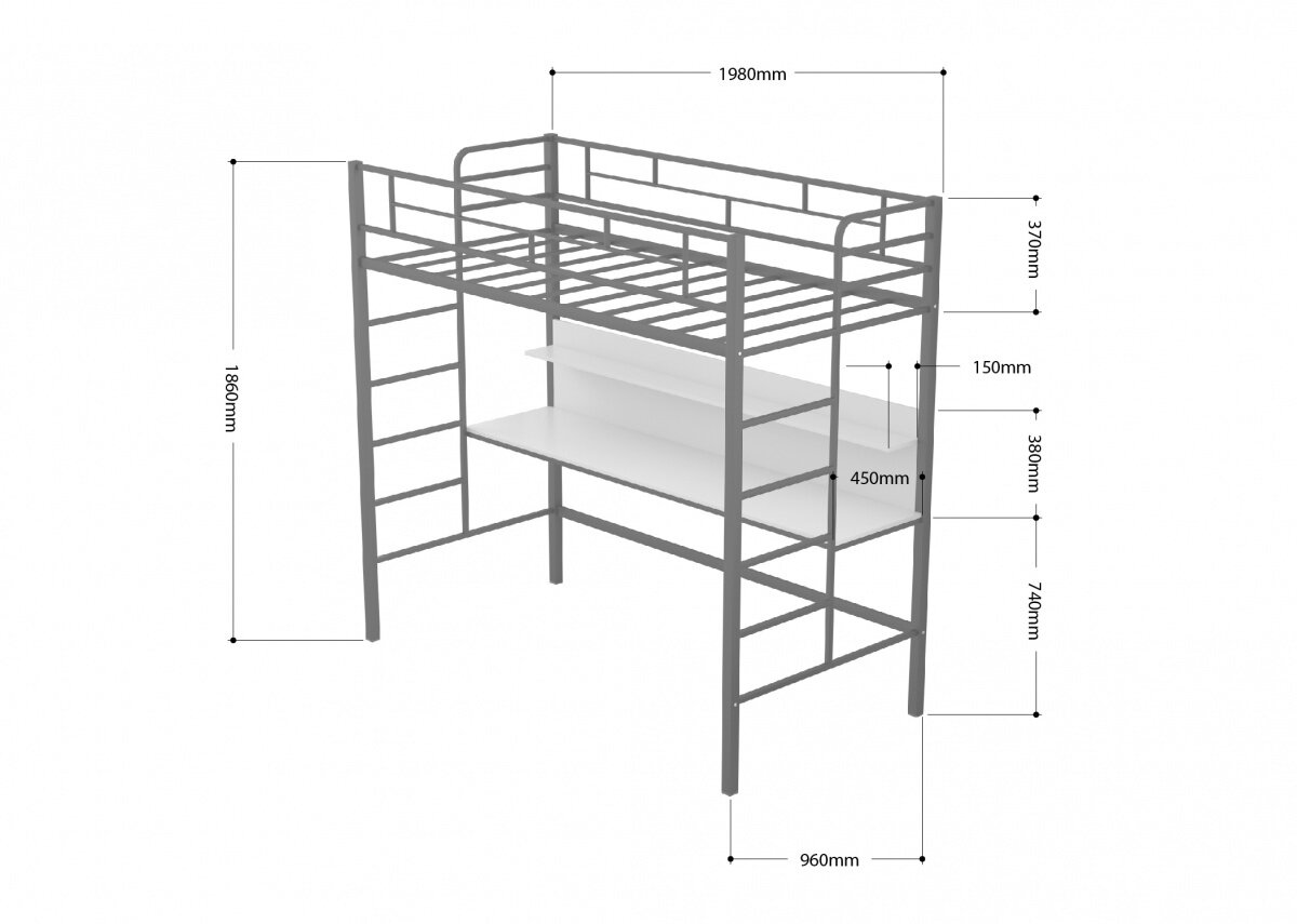 Кровать чердак "Амстердам" Белый со столом/ детская/ 90х190 см/ двухъярусная кровать с рабочей зоной/ для детей и взрослых/ железная/ металлическая/ двухэтажная/ взрослая/ высокая
