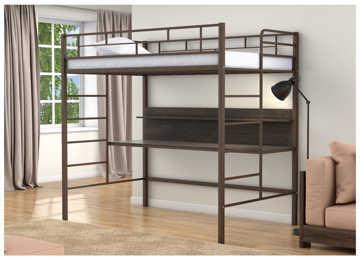 Кровать чердак "Амстердам-120" Коричневый со столом Венге/ детская/ 120х190 см/ двухъярусная кровать с рабочей зоной/ для детей и взрослых/ металлическая/ двухэтажная/ взрослая/ двуспальная