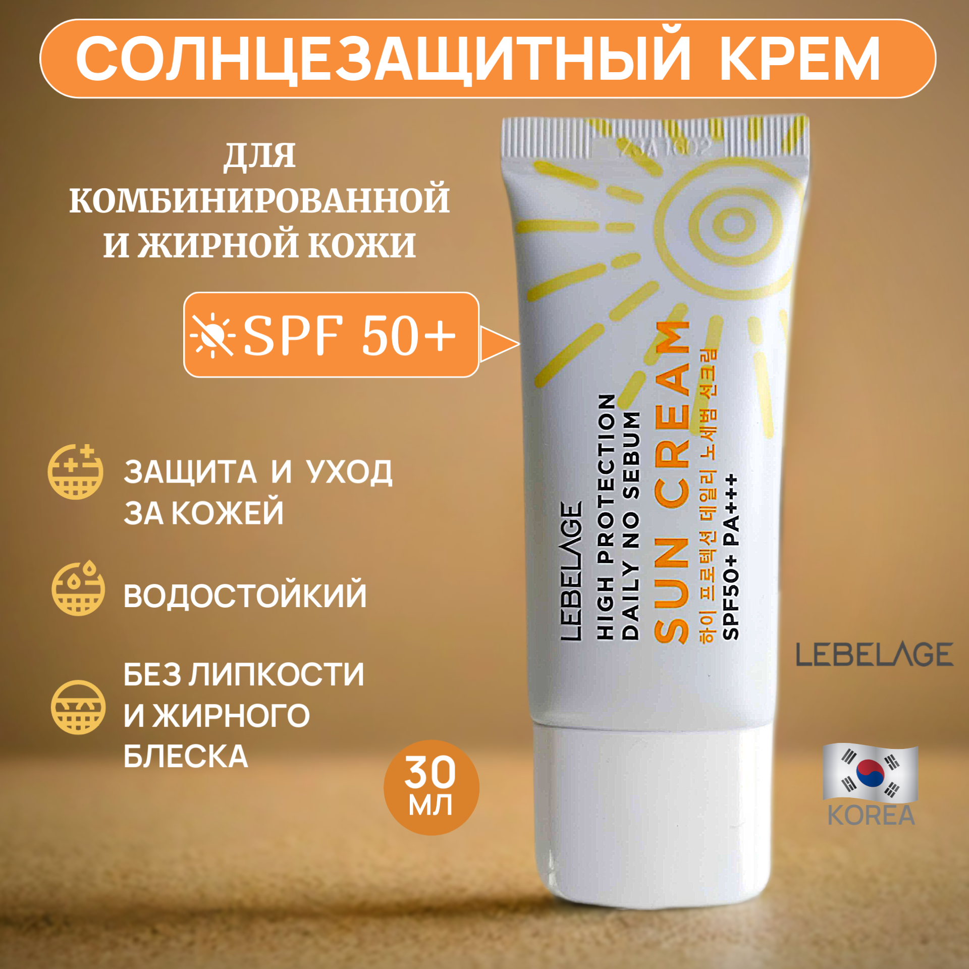 Lebelage Sun High Protection Себорегулирующий крем от солнца для умывания, для снятия остатков макияжа, для кожи лица, шеи и зоны декольте с высоким фактором SPF50+PA+++, корейская косметика. 30 мл информация: