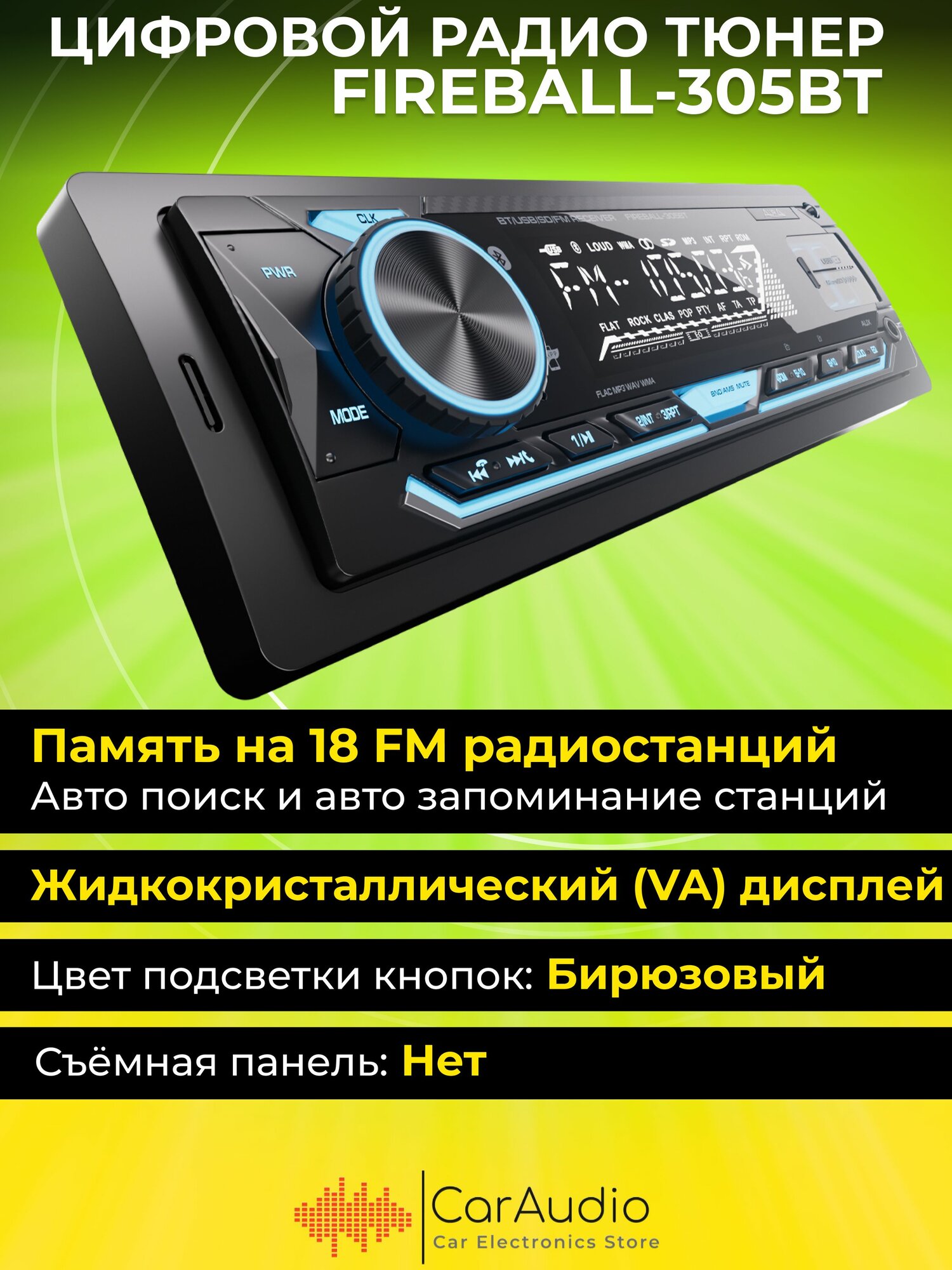 Магнитола Aura FIREBALL-305BT USB/SD-ресивер, подсветка бирюзовая информация: