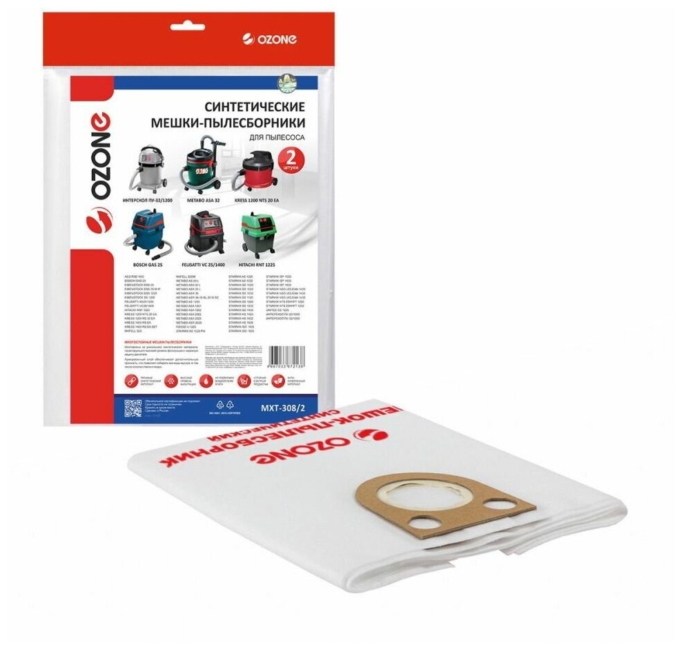 Ozone MXT-308/3 Мешки для пылесоса BOSCH одноразовые, 2 шт., синтетические, не боятся мокрой пыли