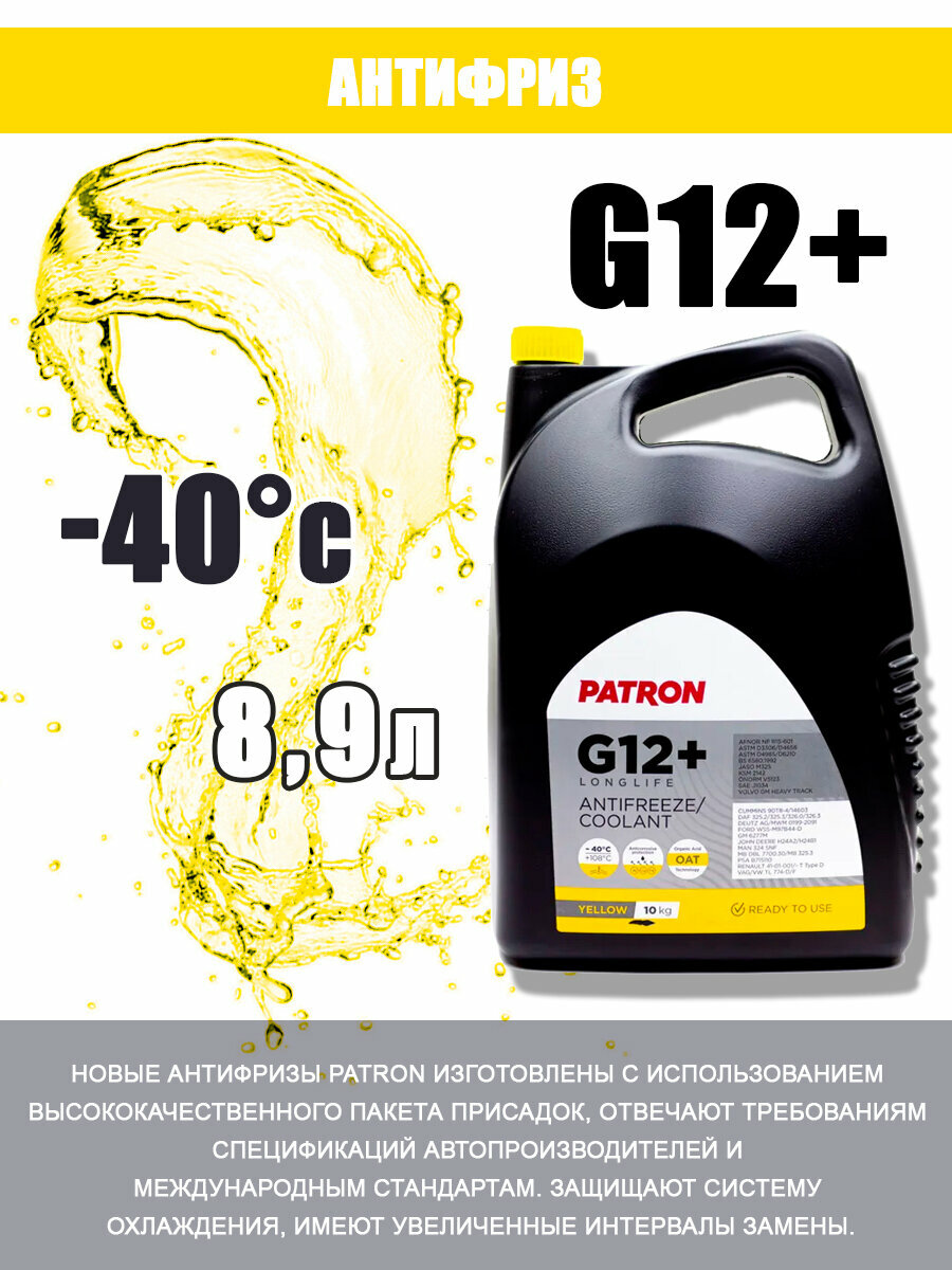 Антифриз 10кг (8.9л) - желтый готовый, PATRON YELLOW G12+, TL 774-D/F, G012A8FA1, DAF 325.2/325.3/326.0/326.3, PSA B715110, RENAULT 41-01-001/- T Type D PCF5010