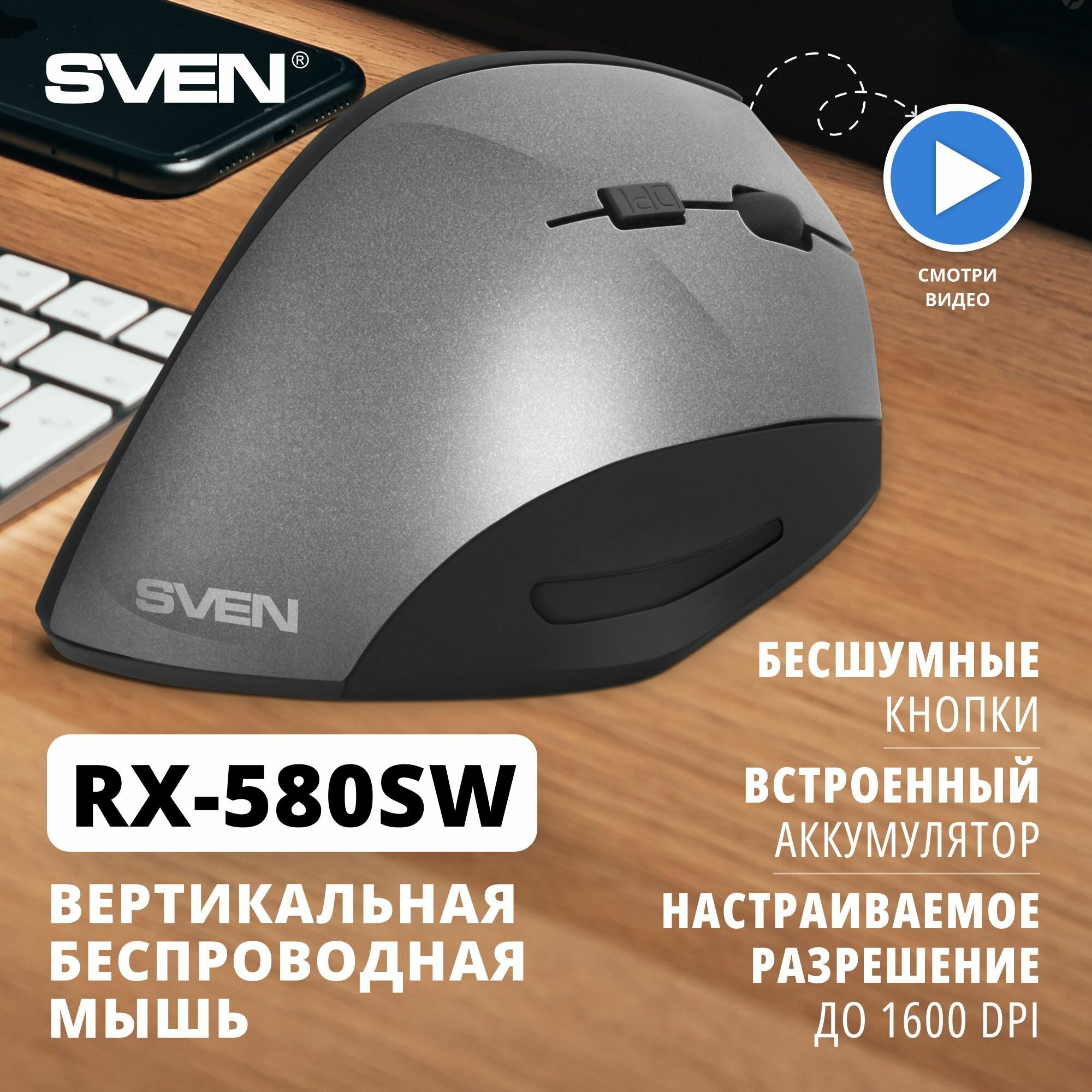 Беспроводная мышь Sven Rx-580sw вертикальная серая (бесш. кл., 5+1кл. 800-1600DPI, Soft Touch, кор)