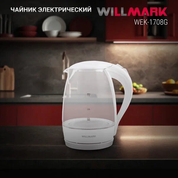 Чайник электрический WILLMARK WEK-1708G 1.7 л, 2.2 кВт, стекло, белый информация: