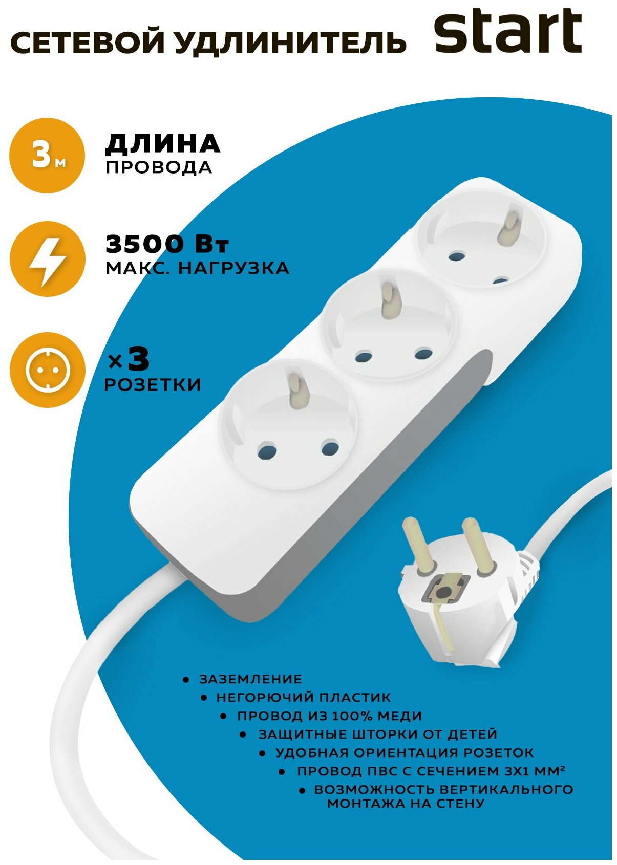 Сетевой удлинитель старт, 3 розетки, 3 м. (ПВС 3*х1 мм), 16А (с заземлением), 3500 Вт