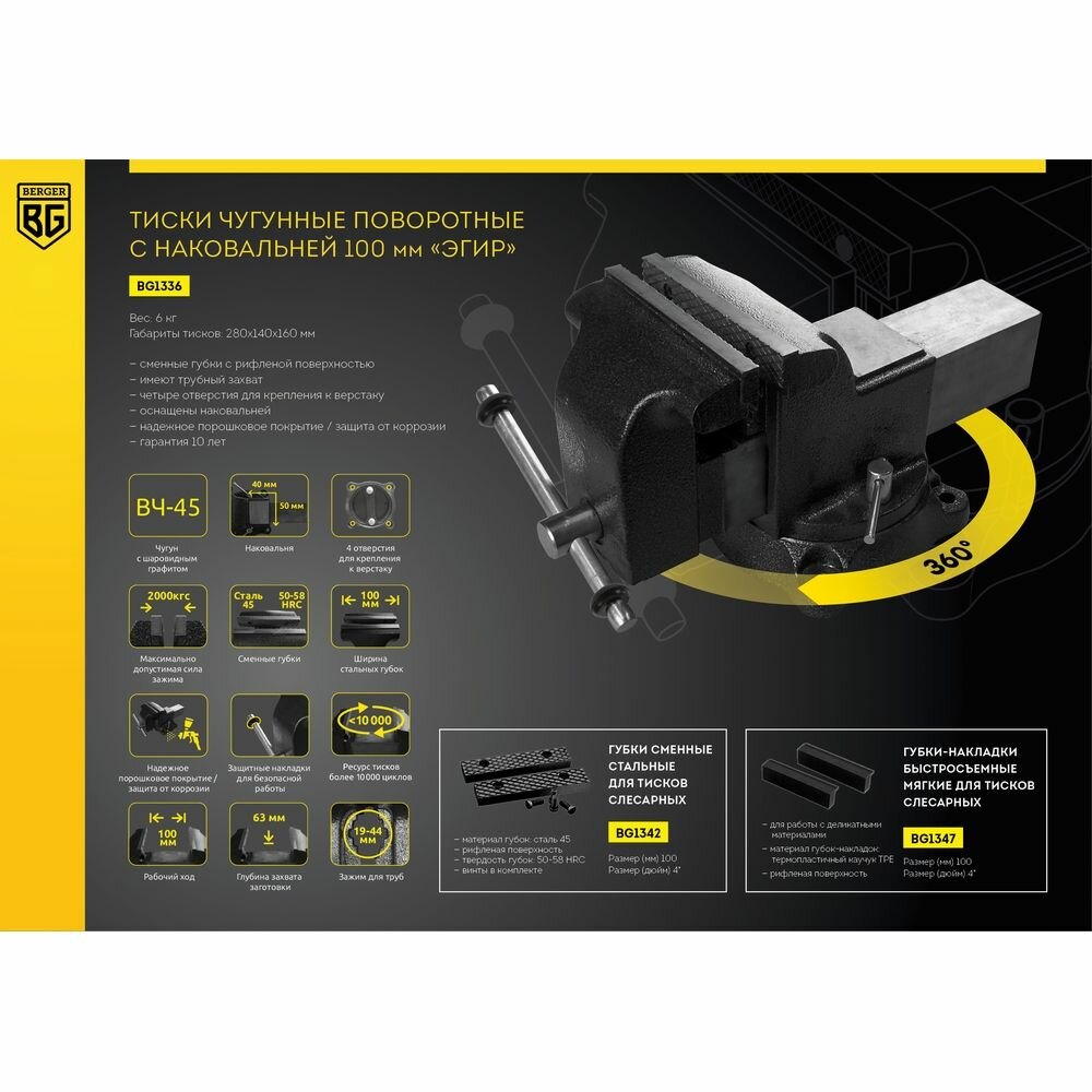 Тиски чугунные поворотные с наковальней "эгир" 100мм BERGER BG1336 информация: