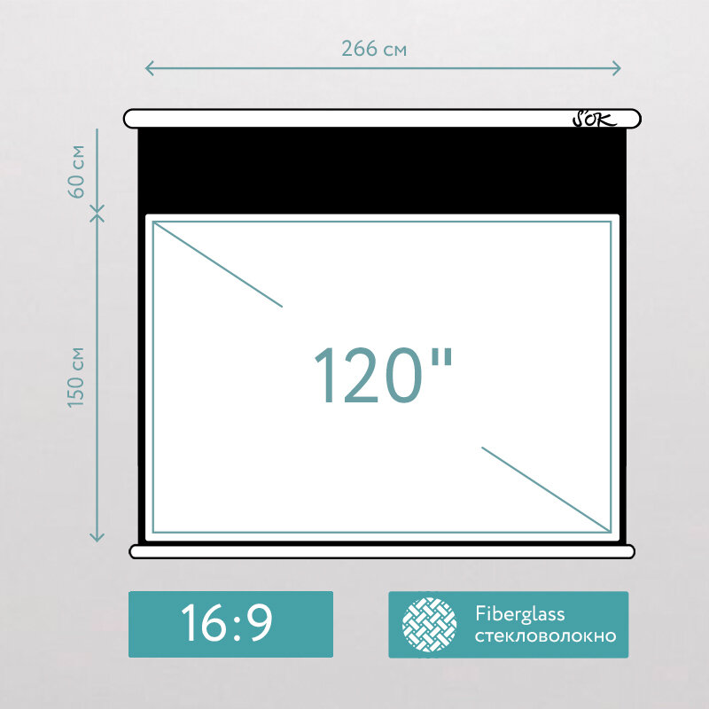 Экран SOK SCPSM-266x150FG-ED60 Pro 120 настенно-потолочный, моторизованный, Fiberglass, белый информация: