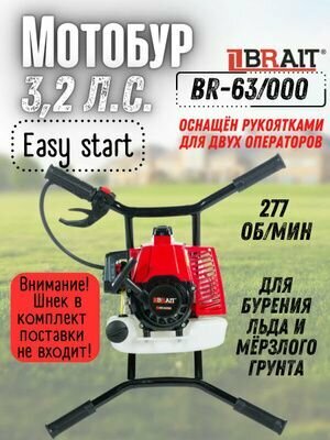 Мотобур 4-х ручный Brait BR-63/000 без шнека (2400 Вт, об/мин 277, объём бака 1.1 л, объём двигателя 63 см3) Бензобур / ямобур / для бурения информация: