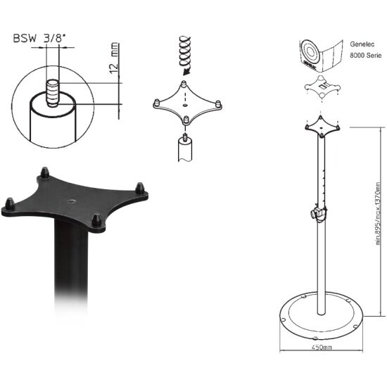 Genelec 8000-403 напольная стойка для мониторов 8010-8030, 8320-8330, 8331, 4020, 4030. Регулировка высоты (870-1565мм). Без верхней площадки, резьба 3/8". Мониторы 4020 и 4030 крепятся без площадки. Диаметр основания 250мм. Вес 5.4кг