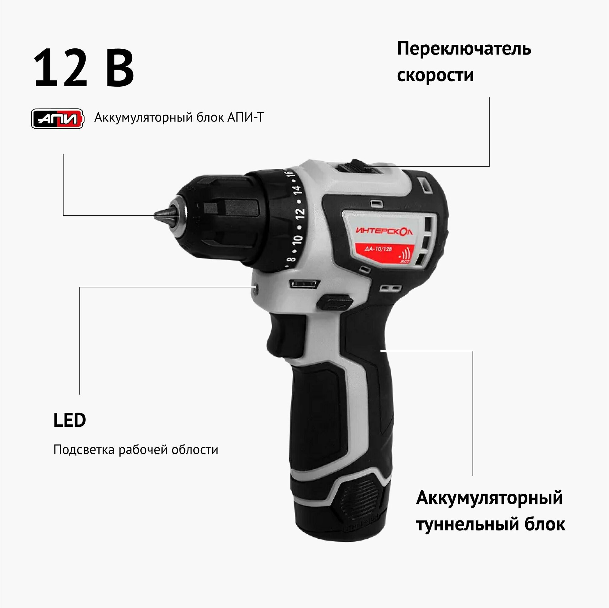Аккумуляторная дрель-шуруповерт бесщеточная ИНТЕРСКОЛ ДА-10/12В (Li-ion, 2 аккум., 1,5Ач) в коробке
