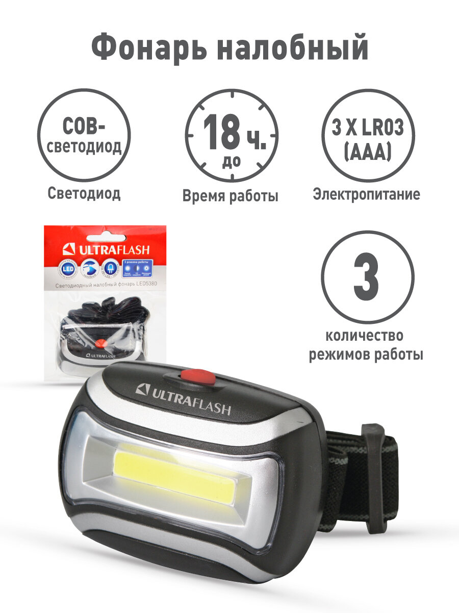 Фонарь налобный LED 5380 (3Вт COB LED 3 режима черн. пласт. пакет) Ultraflash 12870 12870 766 ₽