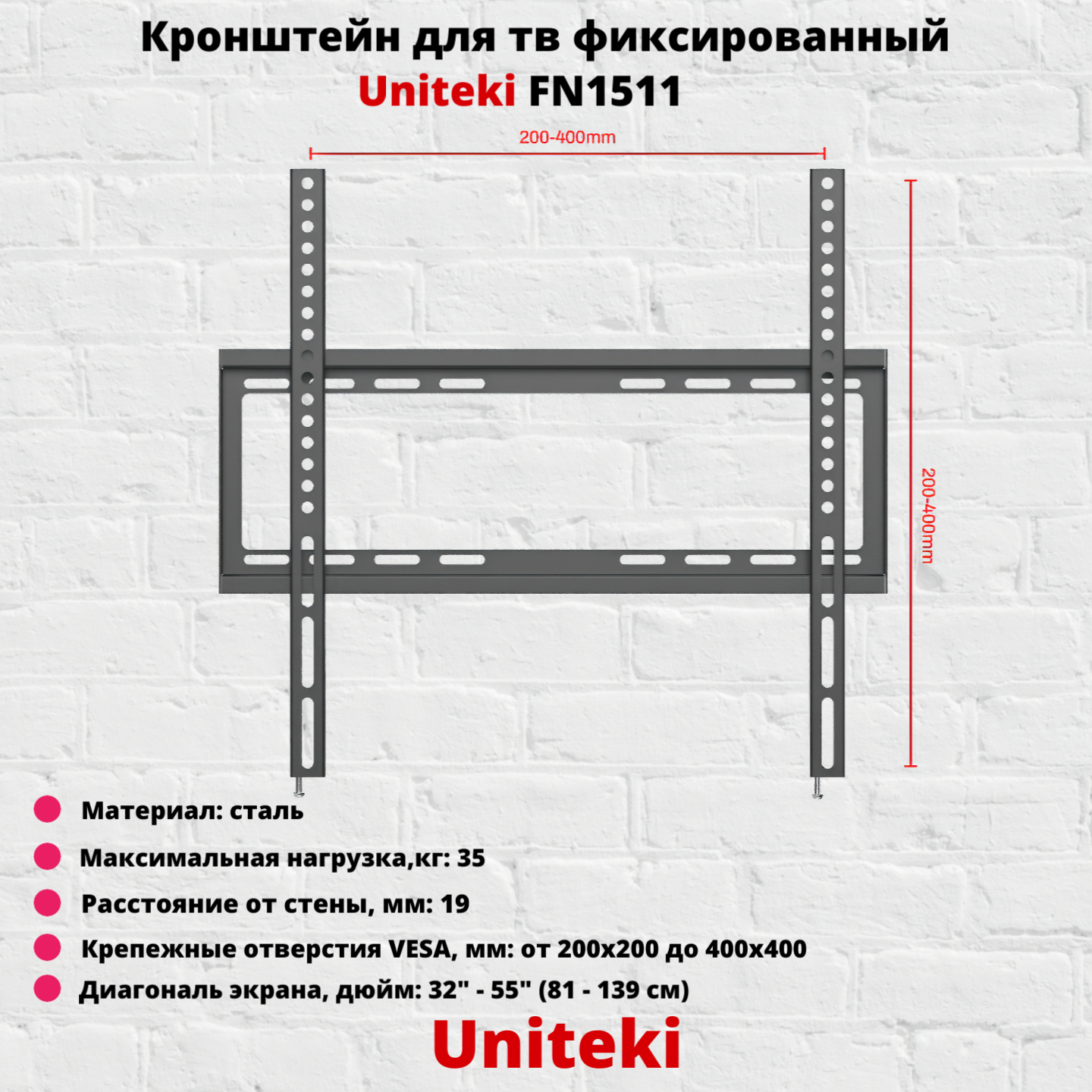 Кронштейн UniTeki FN1511 для телевизора (монитора) на стену фиксированный для диагонали от 32 до 55 дюймов, макс. нагрузка до 35 кг