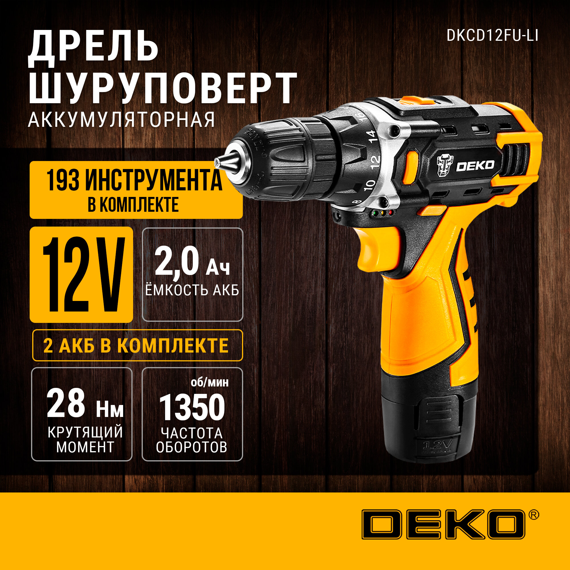 Дрель-шуруповерт аккумуляторная Deko DKCD12FU-Li 063-4139, 12 В Li-Ion 2x1.5 Ач с набором аксессуаров 193 шт информация: