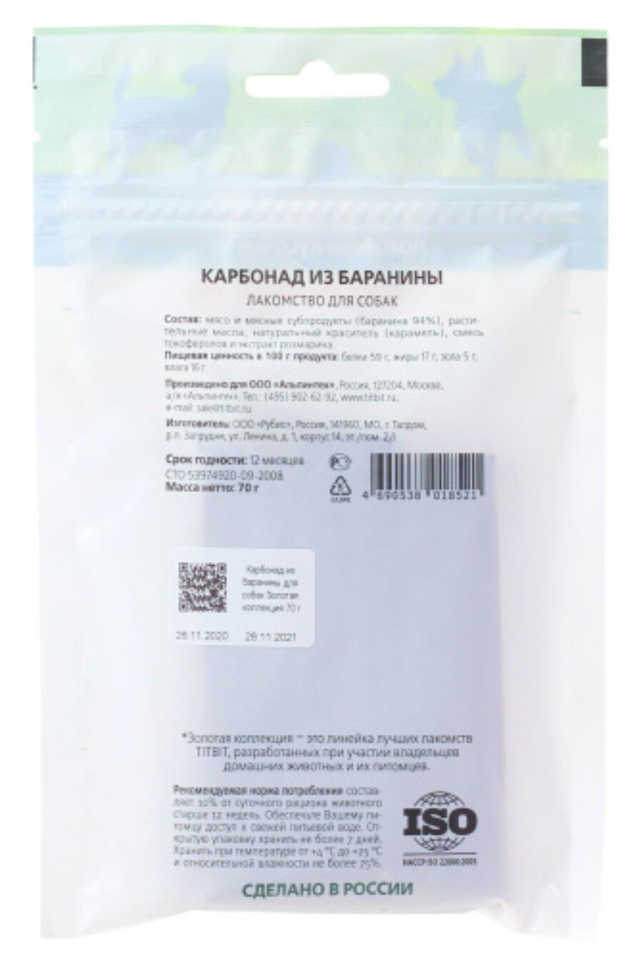 TiTBiT Золотая коллекция Лакомство для собак Карбонад из баранины 70г (5шт) информация: