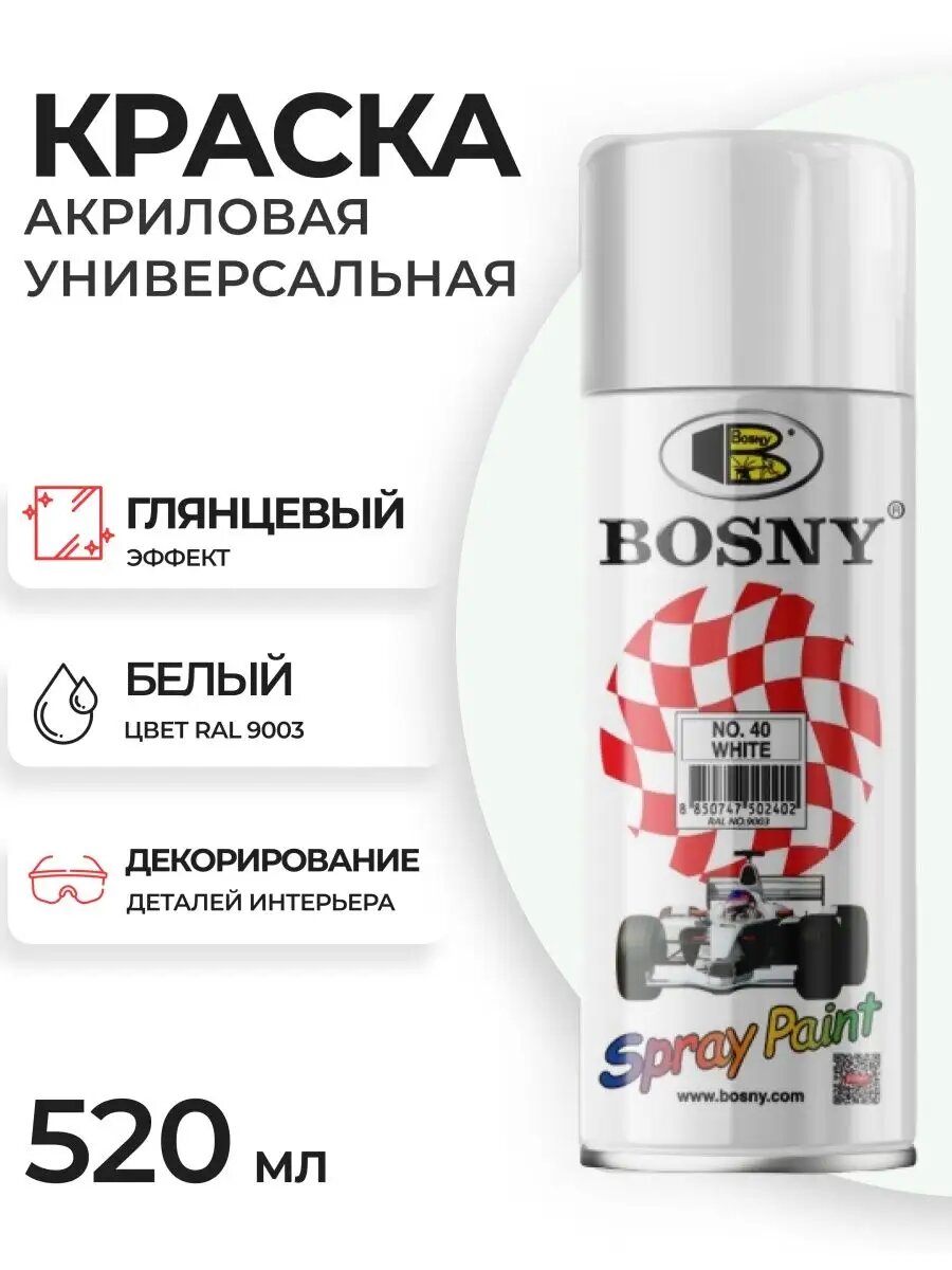 Краска аэрозольная Bosny акриловая универсальная, белая / Краска в баллончике RAL 9003, № 40 (BOSNY NO. 40)