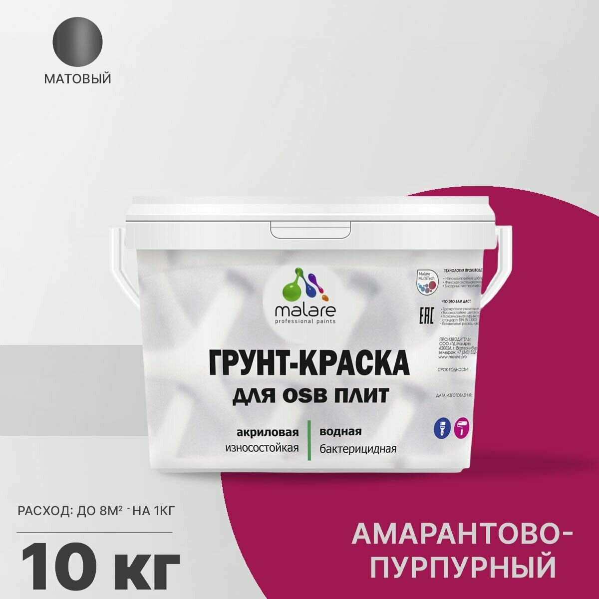 Акриловая краска для ОСБ плит Malare для дерева для наружных и внутренних работ, быстросохнущая без запаха матовая, амарантово-пурпурный, 10 кг информация: