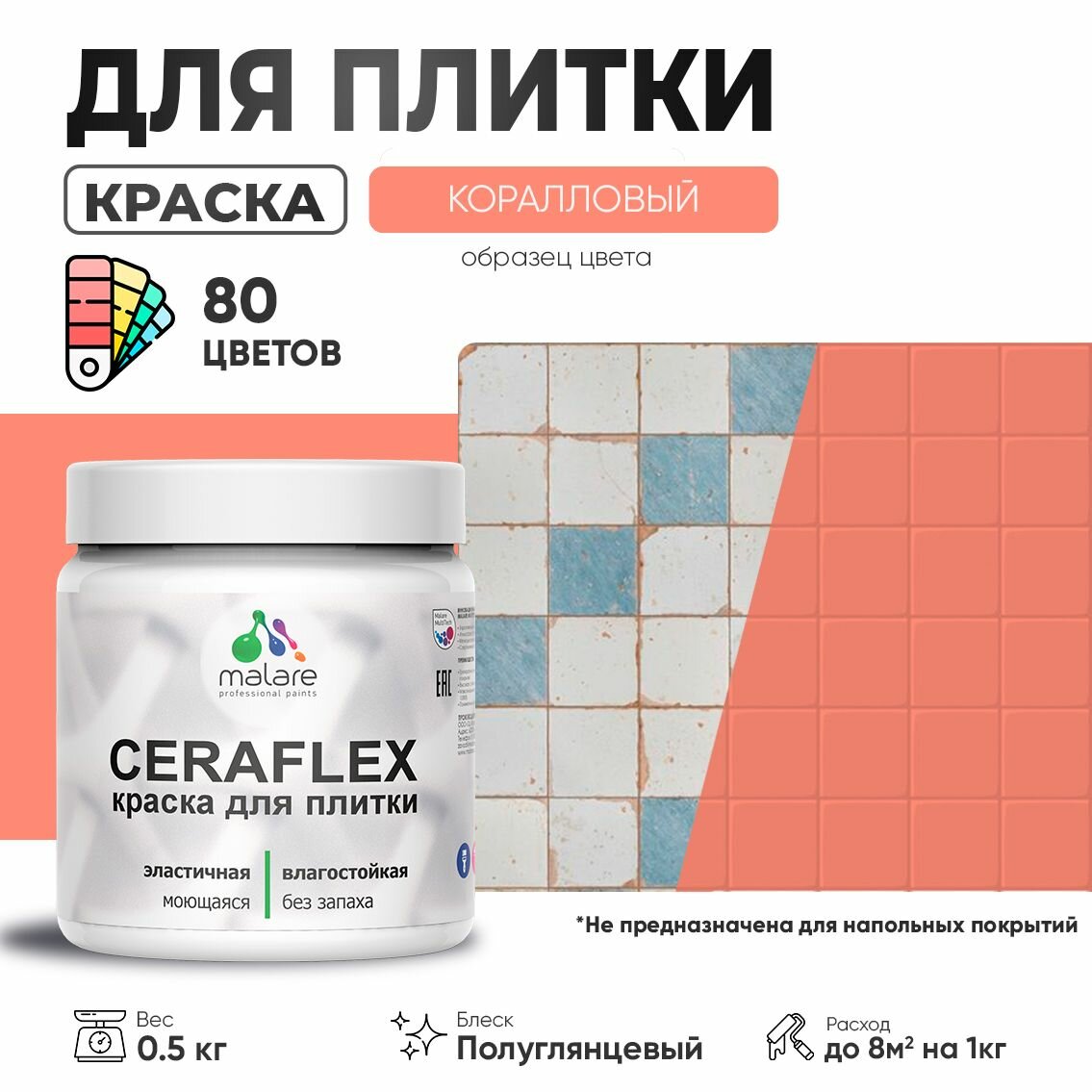 Резиновая краска для плитки Malare Ceraflex для керамической и кафельной плитки, стен в кухне и ванной, моющаяся быстросохнущая без запаха, полуглянцевая, коралловый, 0.5 кг информация:
