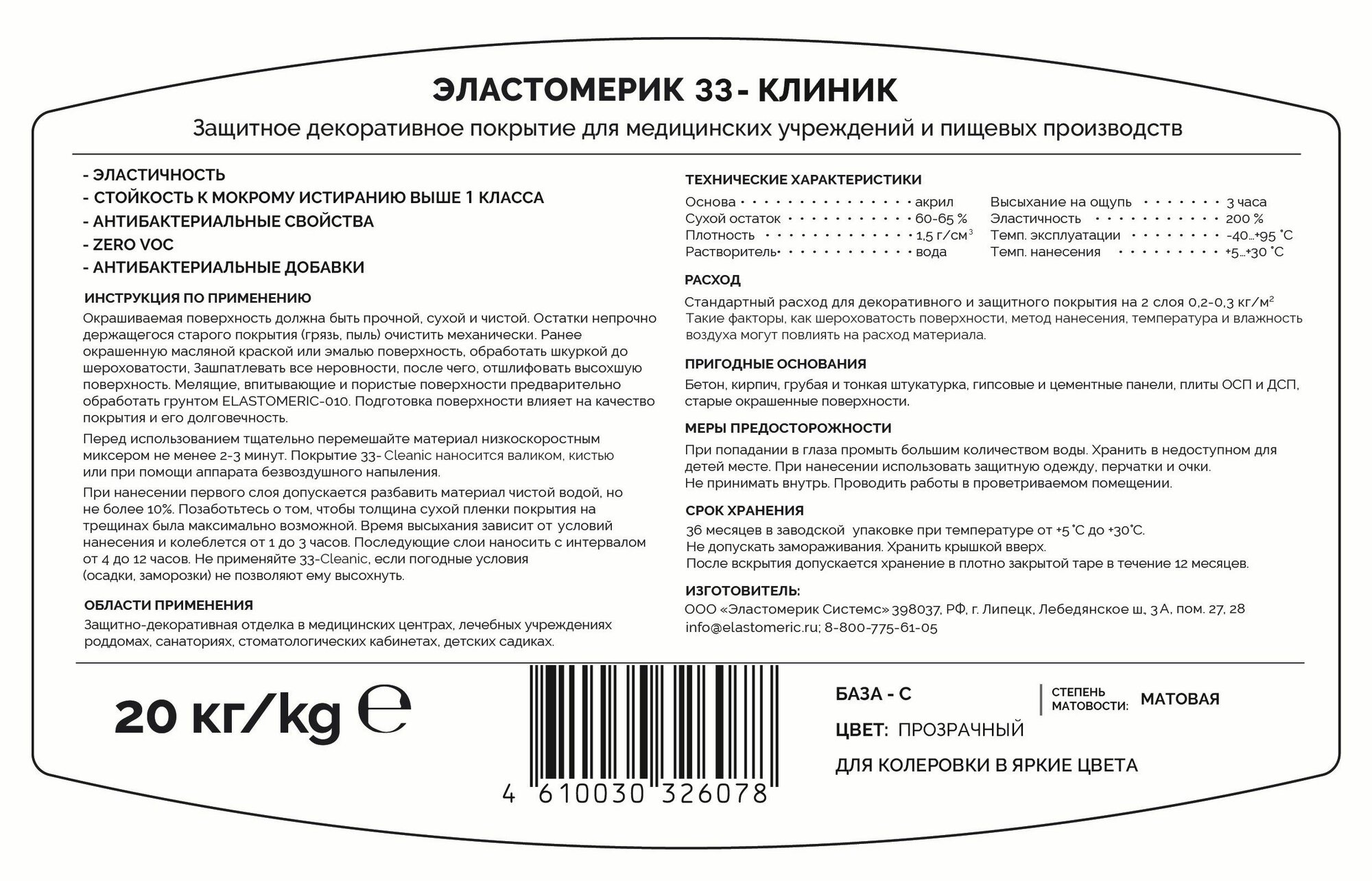 Краска для стен Elastomeric 33 CLEANIC в медицинских учреждениях и пищевых производствах 20кг. база С 14 194 ₽