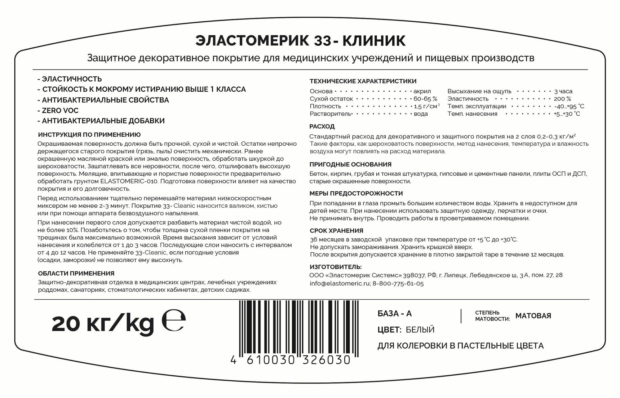 Краска для стен Elastomeric 33 CLEANIC в медицинских учреждениях и пищевых производствах 20кг. база С 14 194 ₽