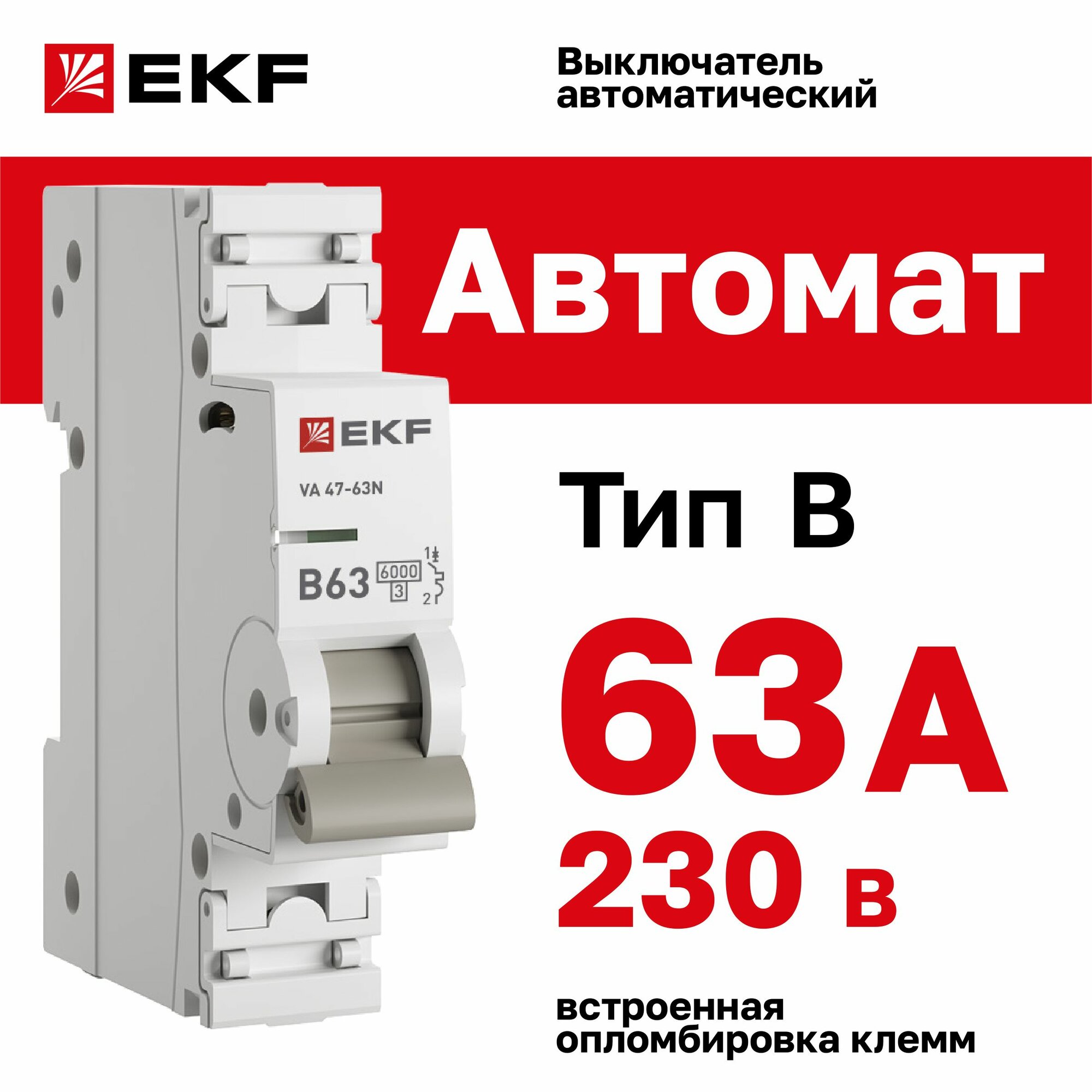 Автомат 63А, тип B, однополюсный 1P, 6кА, cо встроенной опломбировкой клемм EKF PROxima ВА 47-63N (Автоматический выключатель B63) информация: