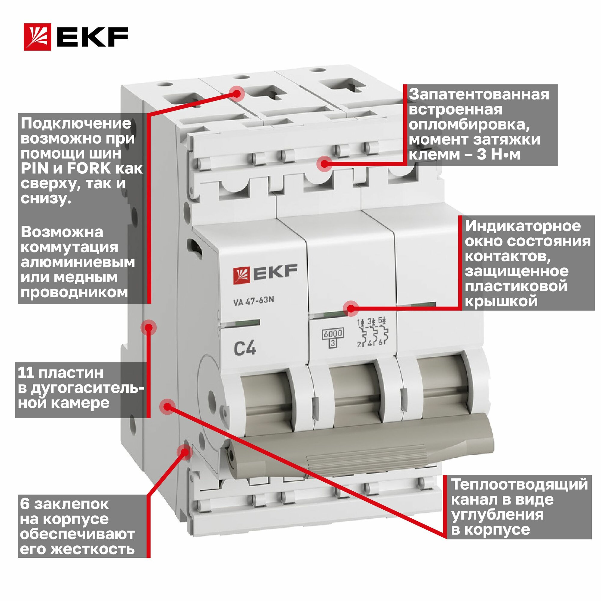 Автомат 4А, тип C, трехполюсный 3P, 6кА, cо встроенной опломбировкой клемм EKF PROxima ВА 47-63N (Автоматический выключатель C4) информация: