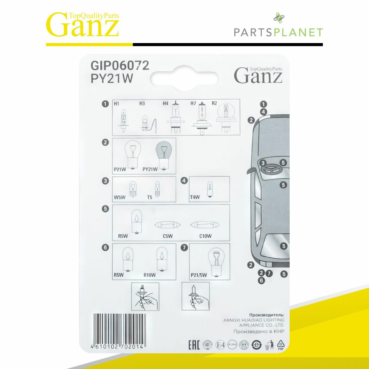 GANZ GIP06072 Лампа 12V PY21W 21W BAU15s GANZ 2 шт. блистер GIP06072
