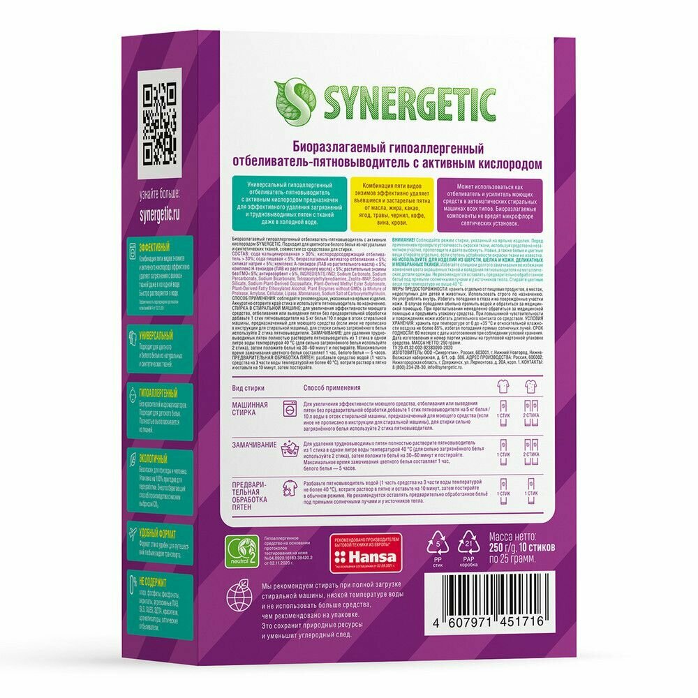 Отбеливатель-пятновыводитель Synergetic с активным кислородом, гипоаллергенный, биоразлагаемый, 10 стиков