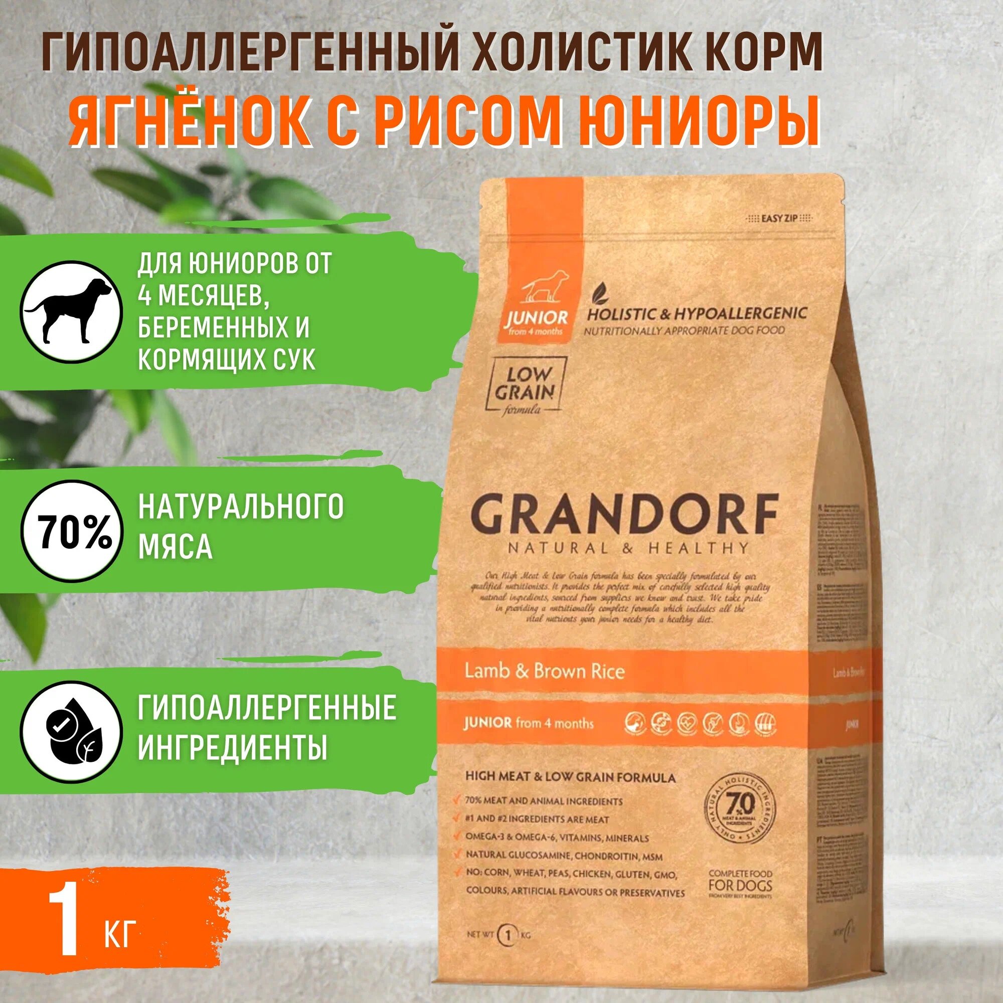 Сухой корм для юниоров в возрасте от 4 месяцев,, беременных и кормящих сук Grandorf гипоаллергенный, Low Grain, ягненок с рисом 1 уп. х 1 кг
