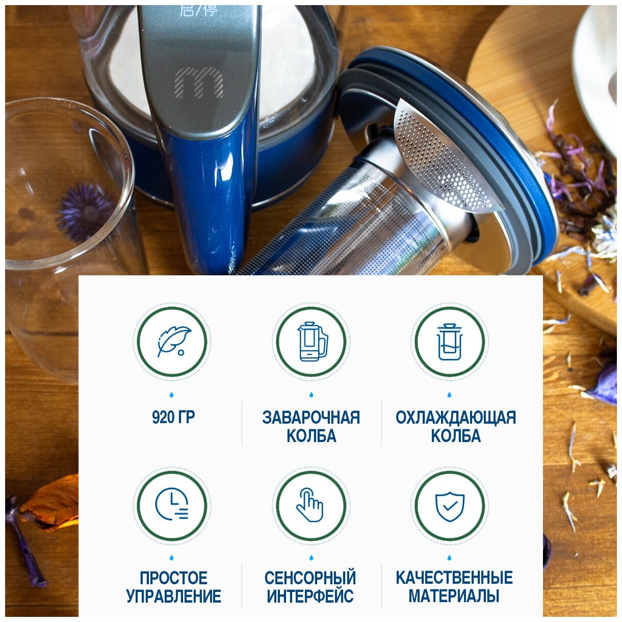 | Особенности | двойные стенки / дисплей / заварочный фильтр / заварочный чайник / индикатор уровня воды / индикация включения / сенсорное управление / съемная крышка / фильтр |