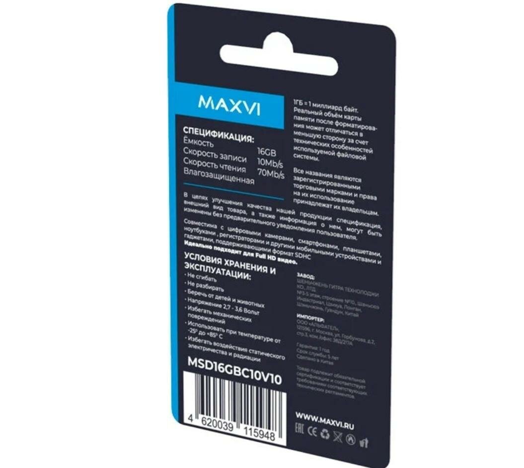 Карта памяти Maxvi microSDXC 16GB, class 10, UHS-I (1), V10 Черный информация: