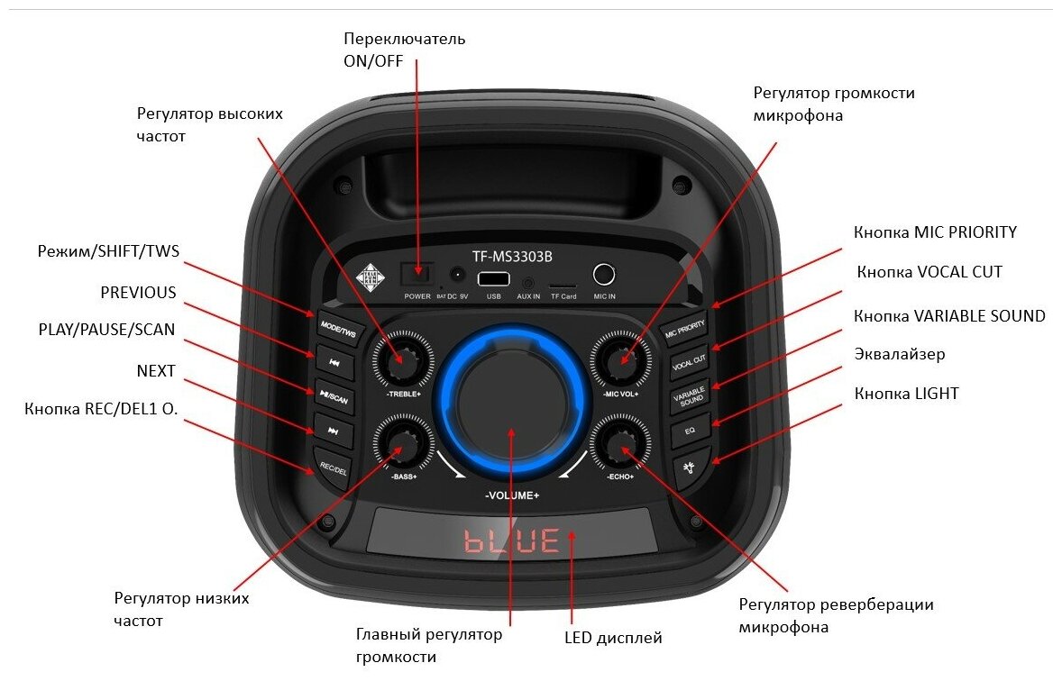 Портативная колонка Telefunken TF-MS3303, 90 Вт, 5000 мАч, TWS, AUX, FM, дисплей, подсветка 14 264 ₽