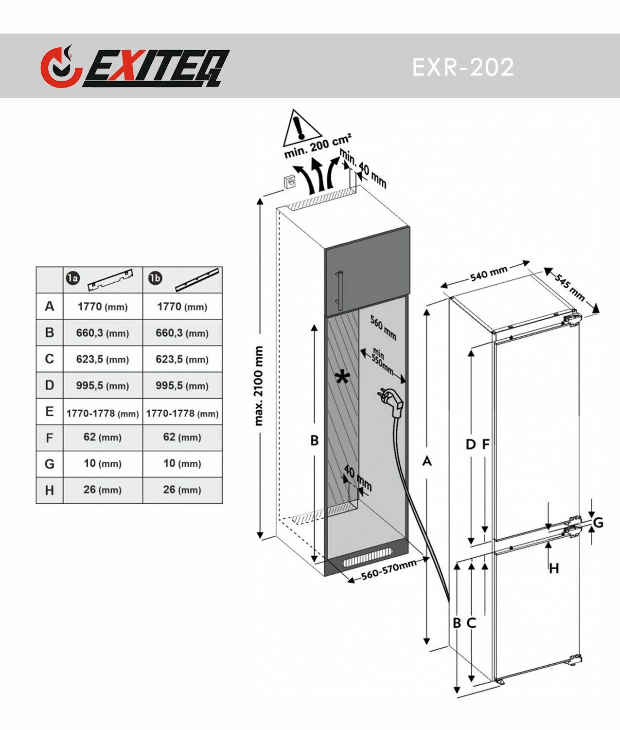 Двухкамерный холодильник встраиваемый EXITEQ EXR-202, высота 177 см, 243 л, класс A+, Китай информация: