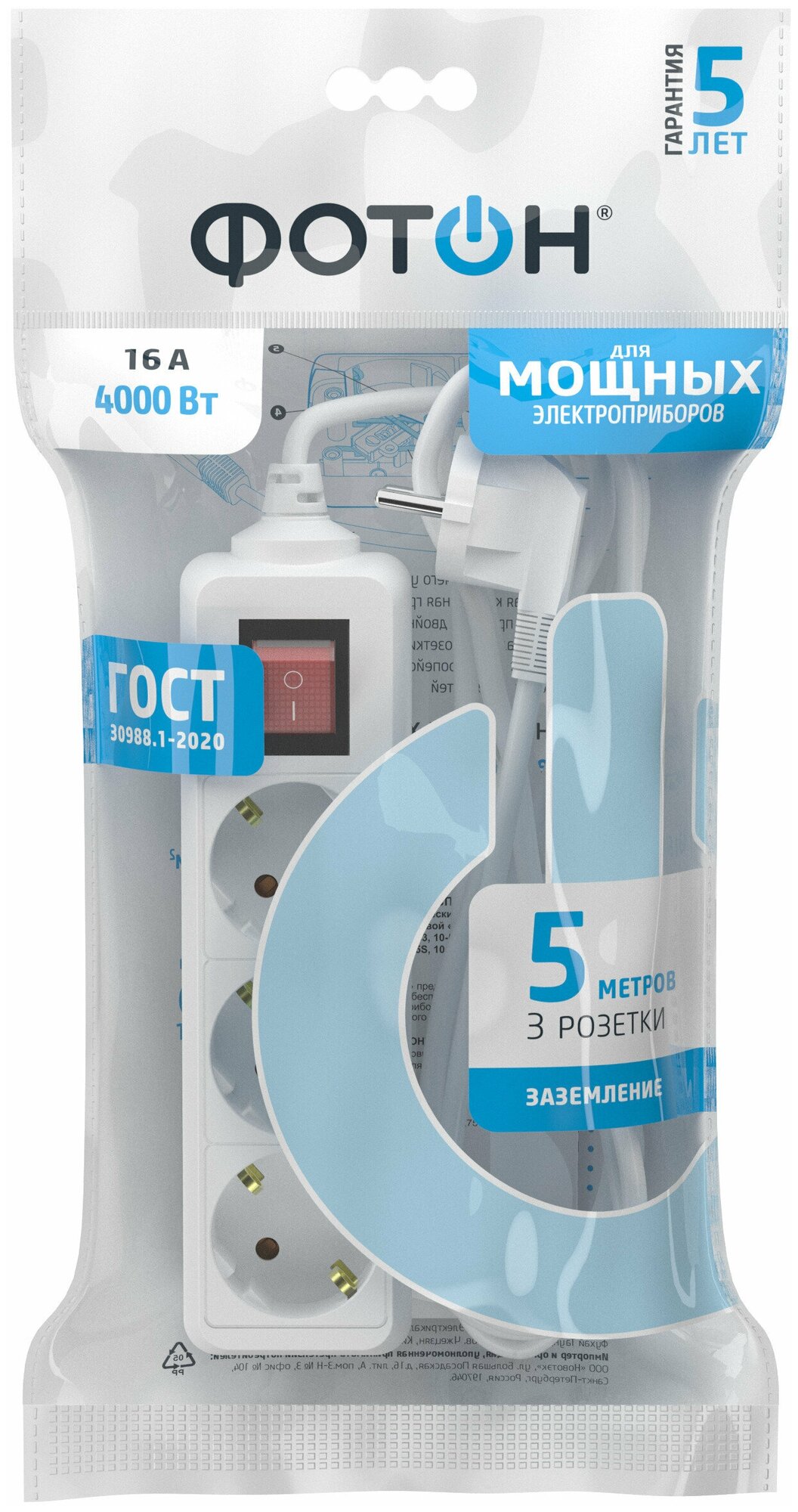 Сетевой фильтр Фотон 16-53ЕS, 5м, 16А, 3 розетки с заземлением, с выключением, белый, 1 шт.