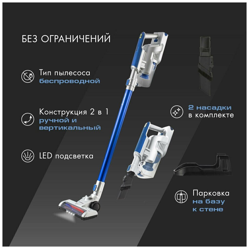 | Дополнительная информация | в комплекте: щелевая насадка 2 в 1, настенное крепление, блок питания, руководство по эксплуатации, гарантийный талон; индикатор заряда батареи |