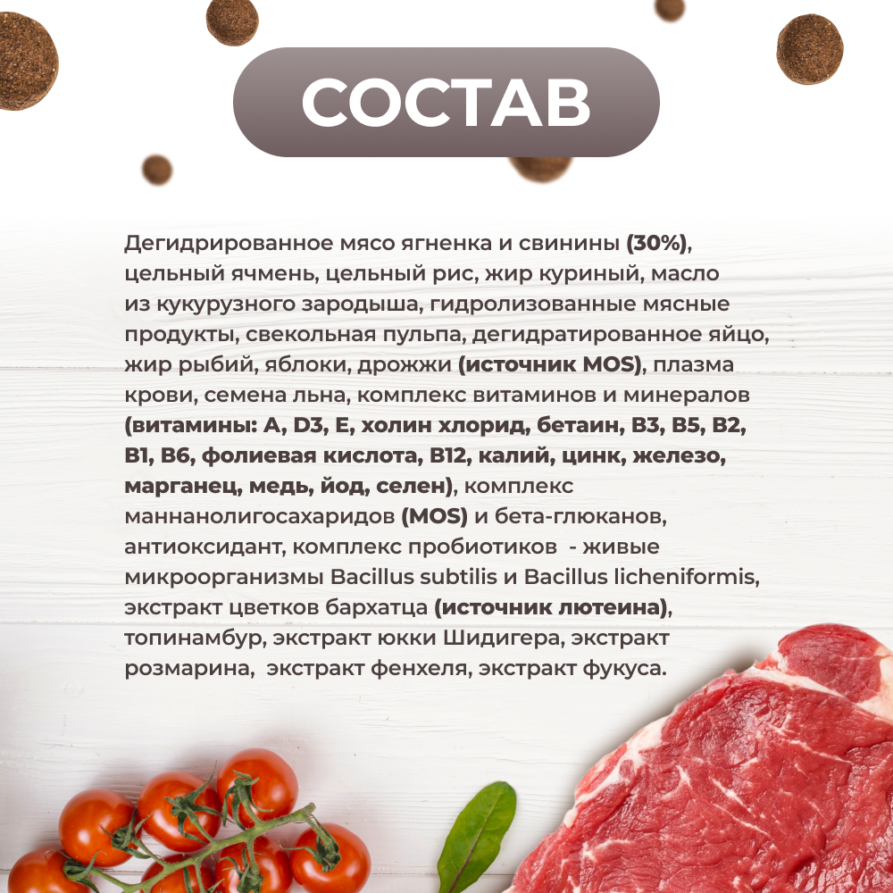 | Состав | дегидрированное мясо ягненка и свинины, кукуруза, рис, гидролизованный белок, рыбий и куриный жир, гидролизованная печень, кукурузные рыльца, сушеная мякоть свеклы, витаминно-минеральный премикс (витамины: А, Д3, Е, холин хлорид, бетаин, В3, В5, В2, В1, В6, фолиевая кислота, В12, калий, цинк, железо, марганец, медь, йод, селен), дрожжи - источник мананн-олигосахаридов (MOS), яблоко сушеное, дегидратированное яйцо, регулятор кислотности, пробиотик - живые микроорганизмы Bacillus subtilis и Bacillus licheniformis, инулин - фруктоолигосахарид (FOS), фенхель, юкка Шидигера, фукус, антиоксиданты (витамин Е и экстракт розмарина) |
