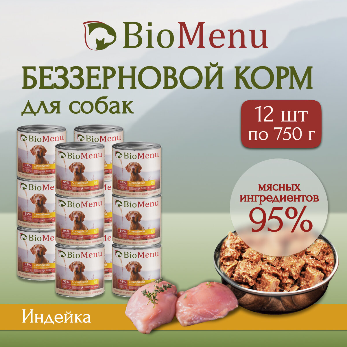 Влажный корм BioMenu ADULT для собак, индейка 750г х12шт информация:
