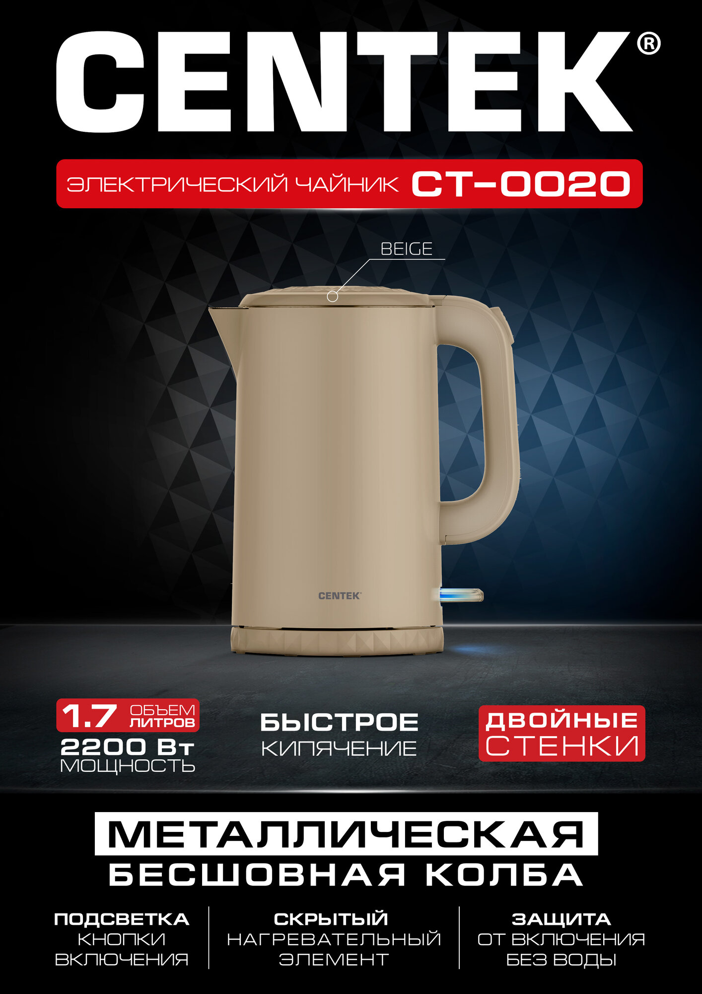 Чайник металлический CENTEK CT-0020 Beige - 1.7л, 2200Вт, двойные стенки, кнопка на ручке информация: