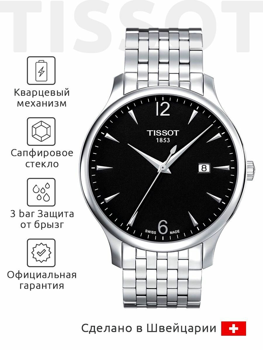 Швейцарские кварцевые часы Tissot Tradition T063.610.11.057.00 на стальном браслете, с водозащитой 3 бара и международной гарантией от производителя 53 100 ₽