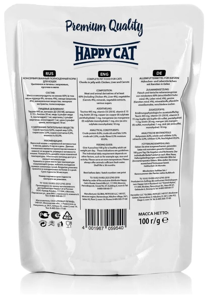 Happy Cat паучи для взрослых кошек с цыпленком, печенью и морковью в желе - 100 г информация: