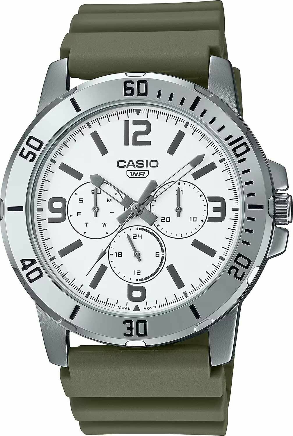 MTP-VD300-3B Casio наручные часы кварцевые WR30 (3 атм) мужские хром, хаки отображение числа, отображение дня недели подсветка стрелок минеральное стекло информация: